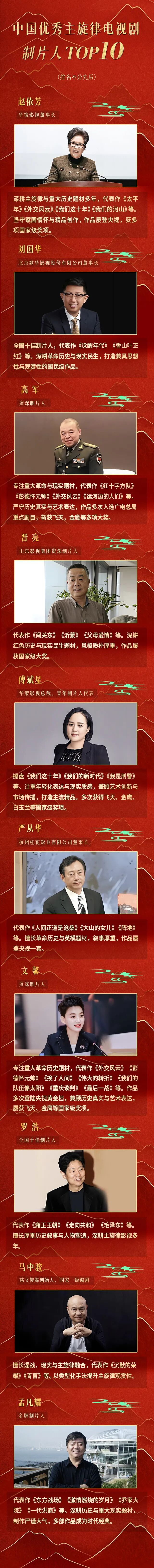 为弘扬时代精神,树立行业标杆,中国优秀主旋律电视剧制片人 TOP10 正式揭晓。榜单聚焦坚守主流价值、深耕精品创作的行业领军者,他们以高度的文化自觉与责任担当,匠心打造多部兼具思想性、艺术性、观赏性的时代力作,用影像传递中国精神、凝聚中国力量。本次发布旨在表彰行业匠心,引领国产主旋律剧集高质量发展,讲好新时代中国故事。