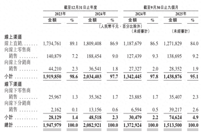 2023年、2024年和2025年前9个月,线上直销金额分别为19.20亿元、20.34亿元和14.39亿元,占比分别为98.6%、97.7%、95.1%;线下渠道金额分别为2812.9万元、4851.8万元、7462.4亿元,占比分别为1.4%、2.3%、4.9%。